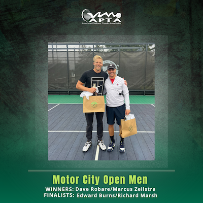 Motor City Open Men's NRT Posted on 11/18/2024 12:00:00 AM by APTA Winners Dave Robare and Marcus Zeilstra Finalists Edward Burns and Richard Marsh6-1, 6-3