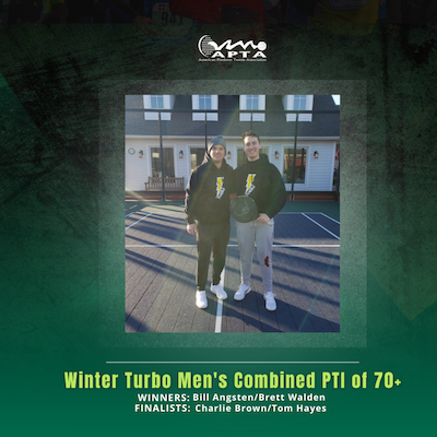 Winter Turbo Men's Combined PTI of 70+ Posted on 1/20/2025 12:00:00 AM by APTA Winners Bill Angsten and Brett Walden Finalists Charlie Brown and Tom Hayes 6-2, 7-6, 1-0